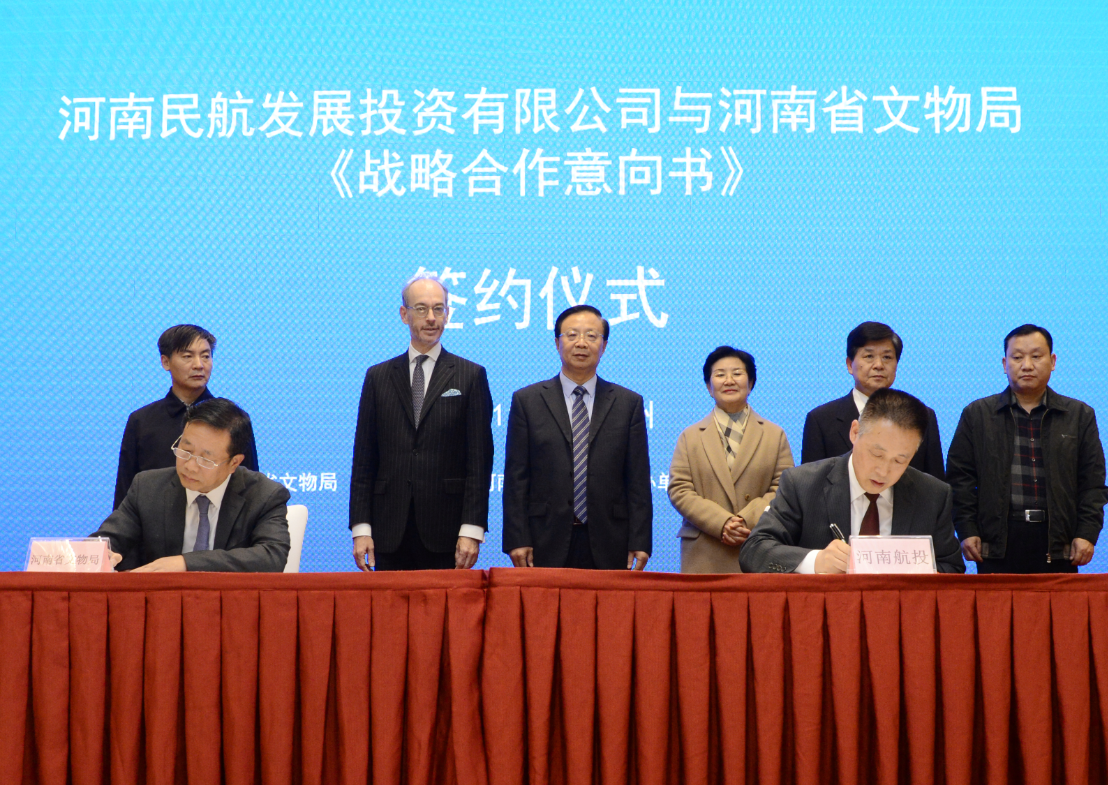 為進(jìn)一步擴(kuò)大雙方合作范圍,儀式最后雙方進(jìn)行了簽約。劉建葆與田凱分別代表河南航投與河南省文物局簽署合作意向書,約定雙方將充分發(fā)揮各自優(yōu)勢,積極落實省政府《鄭州-盧森堡“空中絲綢之路”建設(shè)專項規(guī)劃(2017-2025)》,提升豫歐文化交流水平,促進(jìn)兩地民心相通。